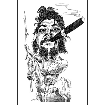 Para nuestro estudio, estas apreciaciones sobre el atractor existencial nos permiten rever la clasificación de las imágenes estereotipadas y no-estereotipadas como propuestas perceptuales figurativas. Comencemos por las segundas. Recordemos [rever imágenes de Serie 2] que en esta serie podíamos agrupar tanto fotografías del Ernesto Che Guevara en diferentes actitudes (sonriendo, fumando, pensativo, muerto), así como una representación caricaturesca que lo asociaba al personaje de Cervantes. Las variantes entre estas propuestas no parecen afectar la actualización del atractor existencial, en ningún momento quedan dudas para quien posee en su memoria la imagen mental de Ernesto Che Guevara que las representaciones logran su eficacia con la actualización de dicha imagen.