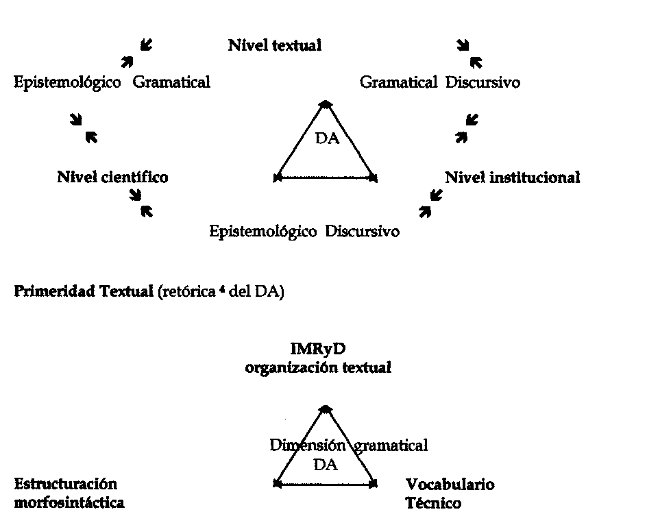 (lógica del DA)El DA es una semiosis que se identifica por sus fines, sus actantes y su estructuración. La intención comunicativa del DA no opera sobre la elaboración del conocimiento ni sobre su divulgación general sino sobre su discusión y reflexión entre pares, es una instancia de debate. En este nivel, el DA concentra el discurso científico, sus requerimientos metodológicos integrándolos a prácticas comunitarias de los expertos; como práctica discursiva el DA se manifiesta mayormente como una operación de intersubjetividad tensional.